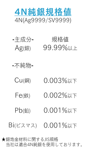 シルバー9999、シルバー950、シルバー925ソフトシートの販売価格は、4N純銀をベースに計算されています。950銀、925銀は同一価格での販売となります。